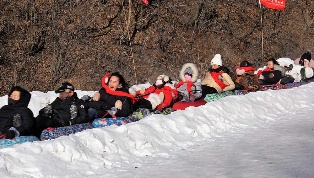 2018年的冰雪节是12月22日开始 天女山重点打造了最刺激的1500米天然雪道,是在十八弯的第一弯处作为起点,游客拉着雪圈,呼吸着清新的空气,有说有笑,疯疯闹闹的到达1500米的雪道起点,大家把雪圈连成串,连的越长速度越快,雪地小火车一路疯狂的尖叫着顺势而下,到达终点都坐在雪圈上笑的前仰后合不肯离开,回味着惊险刺激的过程.